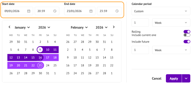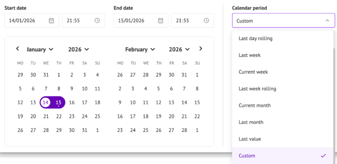 • Marco de Tiempo Futuro Añadido: El período futuro extendido se resalta en un tono de Púrpura Más Claro en el selector de calendario.