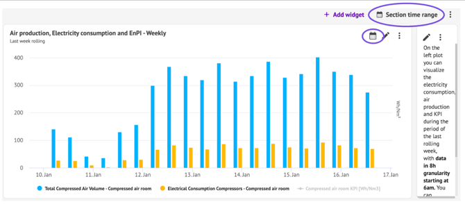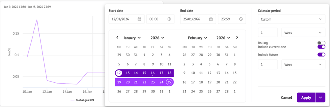 Puede ser relevante visualizar datos futuros para tomar decisiones estratégicas u operativas vinculadas, por ejemplo, a la estimación de la demanda energética, la previsión del presupuesto de energía, la gestión de activos o la optimización de la matriz energética. La función Incluir el futuro te permite extender el marco de tiempo del widget más allá de la fecha actual, para que puedas visualizar datos de pronóstico como la demanda de energía del día siguiente, la planificación de la producción o modelos de regresión; junto con su desempeño histórico.