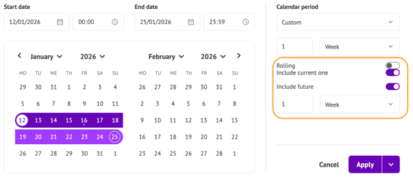 • Activación Automática: Si activas "Incluir el futuro" mientras tu widget está configurado en una fecha pasada fija, el sistema habilitará automáticamente el interruptor Periodo deslizante para garantizar que la ventana futura avance con el tiempo.
