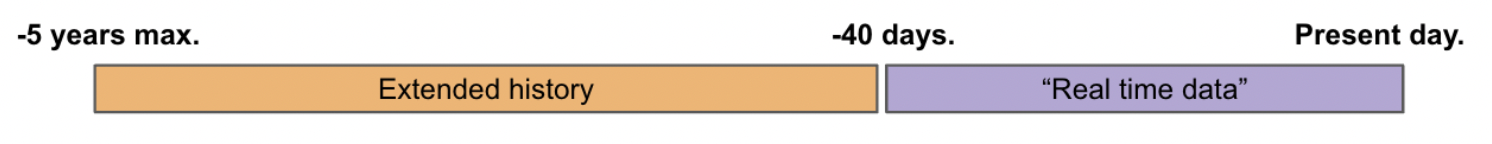 Data is recalculated on the last 40 rolling day in order to guarantee the most accurate data. These 40 rolling days + present day are the ones that are sent everyday to ensure the synchronization in “Real time”. - Extended history