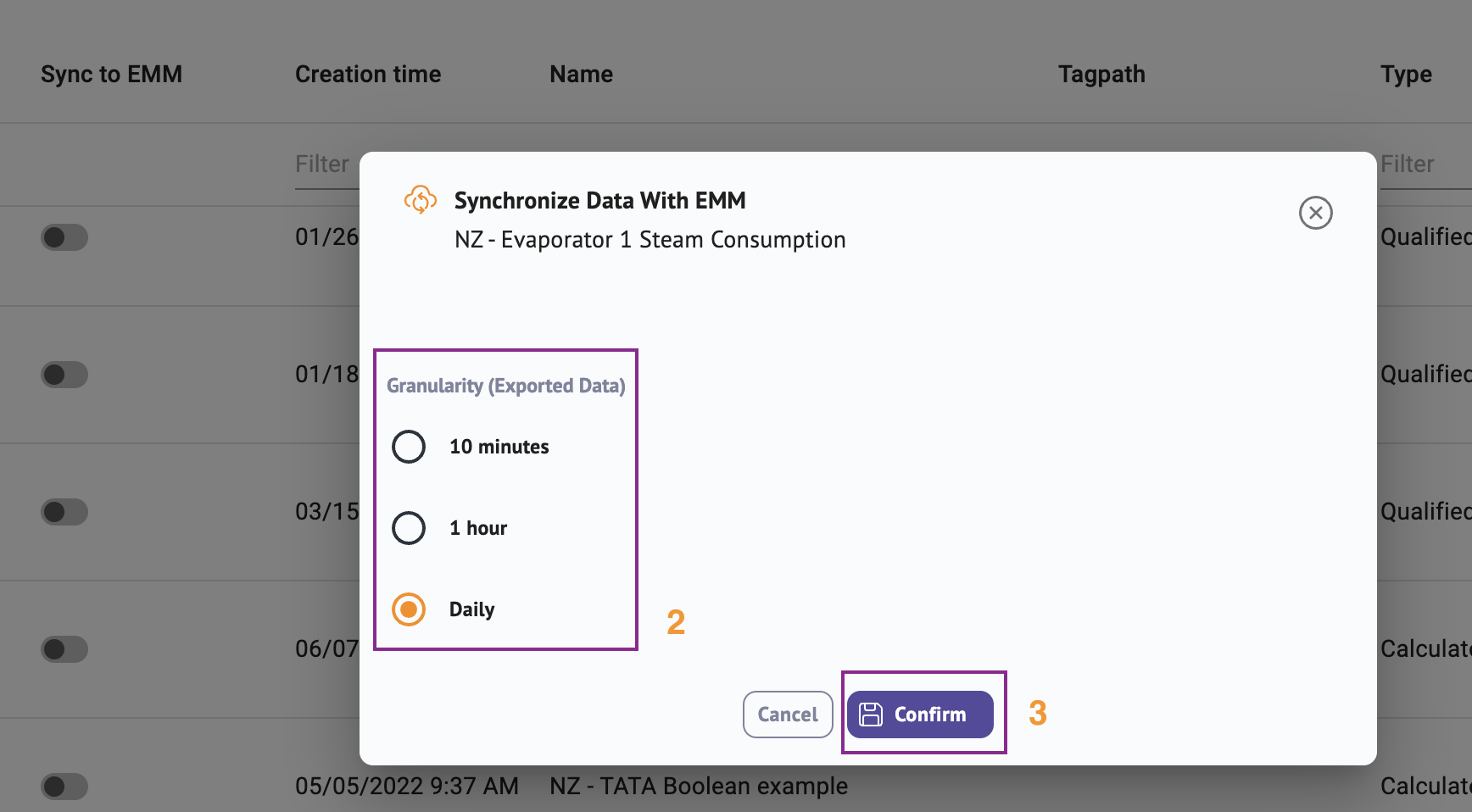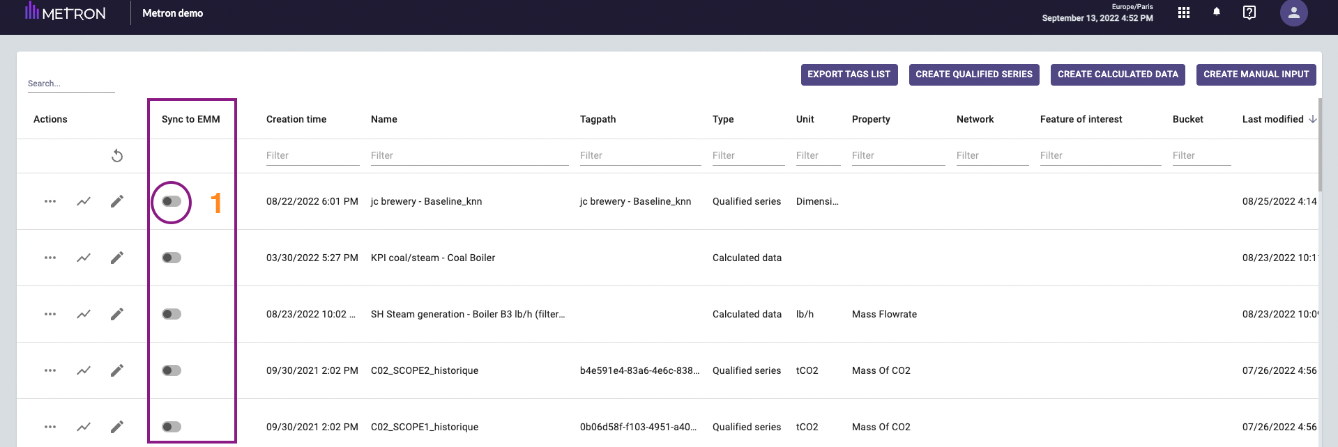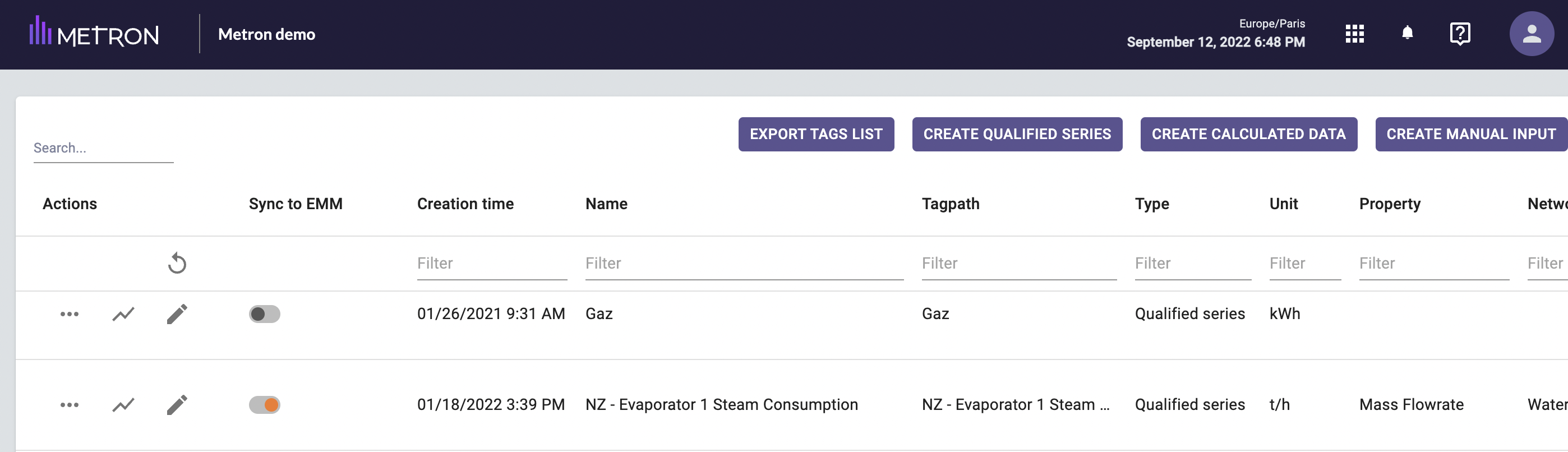 Ex: on the image below, the qualified serie "NZ- Evaporator 1 Steam Consumption" is synchronized with EMM.