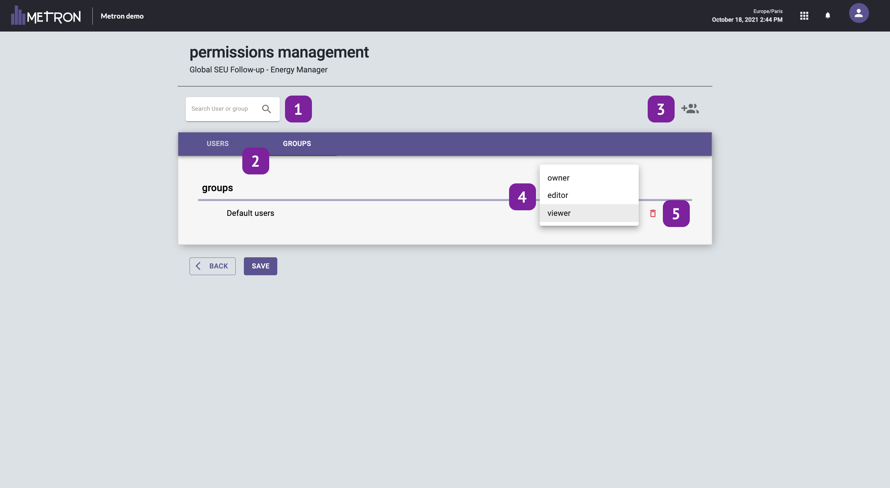 Note: User groups are defined beforehand during platform setup. If you want to modify the users associated with a group, please contact your METRON operations engineer. - Add user or users group: a drop down menu will appear with the list of users/group of users associated with your platform. Each new page user is assigned as a "Viewer" by default.