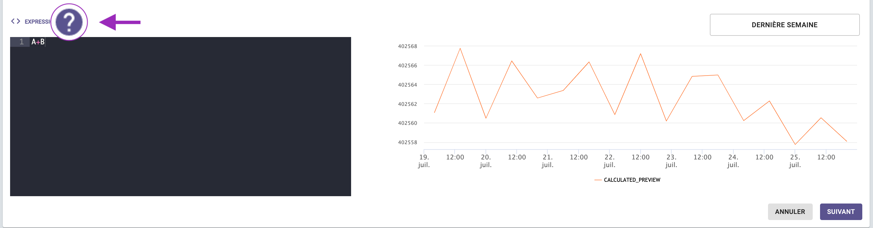 The expression panel allows you to write the mathematical equation for the calculated series associating multiple variables. To know the different formulas available and to get help concerning the syntax used on the METRON-Factory platform, click on the "?" button.