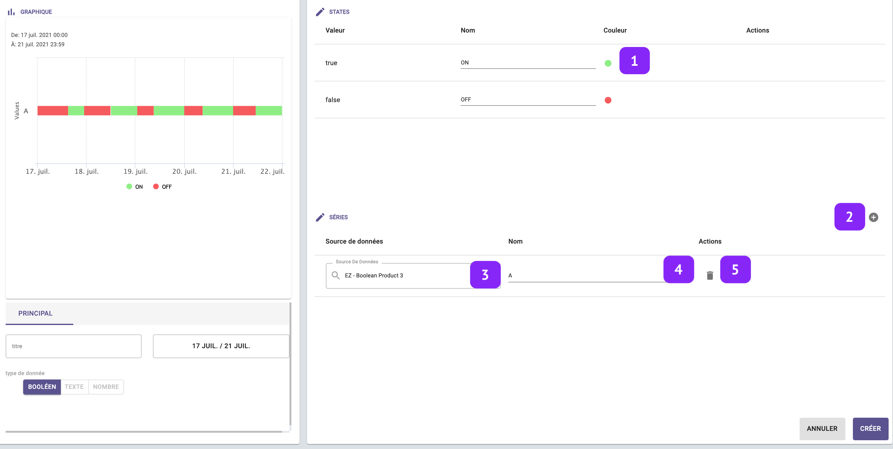 Only Booleans variables, with two states, can be added to a chronogram. (usually true/false value) Each variable has a dedicated bar in the widget, including two different colours, depending on the state of the Boolean.