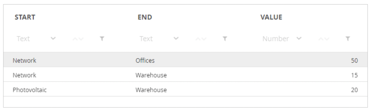 Dans cet exemple, on part des compteurs “Network” et “Photovoltaic” (colonne START) et on suit les liens SUPPLY pour retrouver les zones qu'ils alimentent. On récupère alors les zones alimentées (colonne END) et les consommations associées (colonne VALUE).