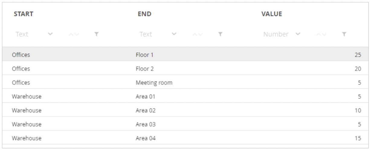 La partie source de ce widget affichera une ligne par relation (flux entre deux entités), qu'elle soit dans le premier étage du diagramme (à gauche) ou à n'importe quel niveau de profondeur (le diagramme n’étant pas limité à un ou deux étages).