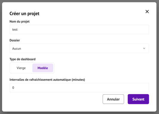 - Sélectionnez "Modèle" comme type de dashboard