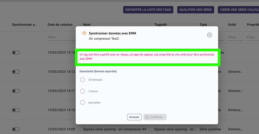 - Chaque série/tag synchronisée sera mise à jour dans EMM une fois par jour à 8 heures.