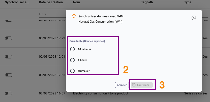 Lors du processus de synchronisation d'une série/tag, vous devez choisir une granularité :