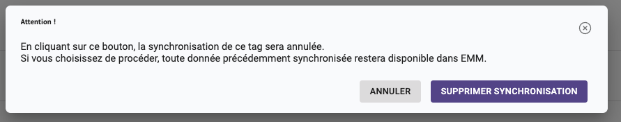 Afin d'éviter toute surcharge de votre plateforme EMM, le nombre de tag que vous pouvez synchroniser est limité de 50 à 100 données par EOM.